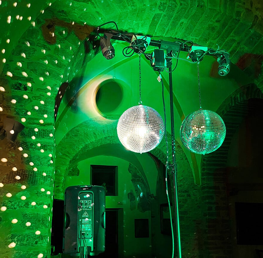 Il nostro team si occuperà di tutto. Porteremo l’attrezzatura tre ore prima dell’inizio e il nostro Tecnico luci ne curerà la configurazione completa. Che la tua festa sia a Perugia, Firenze o Siena, ti garantiamo un impianto luci perfettamente funzionante, dinamico e scenografico, senza che tu debba preoccuparti di nulla. Ci assicuriamo che ogni effetto luce sia pronto a creare la giusta carica per la pista da ballo.